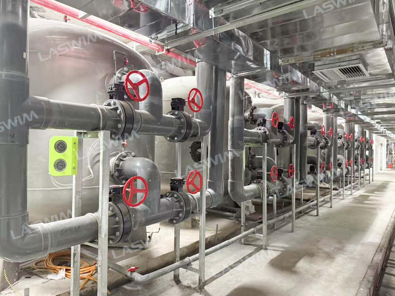 由广东联盛水环境工程有限公司承建的室内恒温游泳池,水面面积达1250平方米,水深1.8-1.9米。游泳池水处理机房位于负二层,除湿热泵机房位于一层。